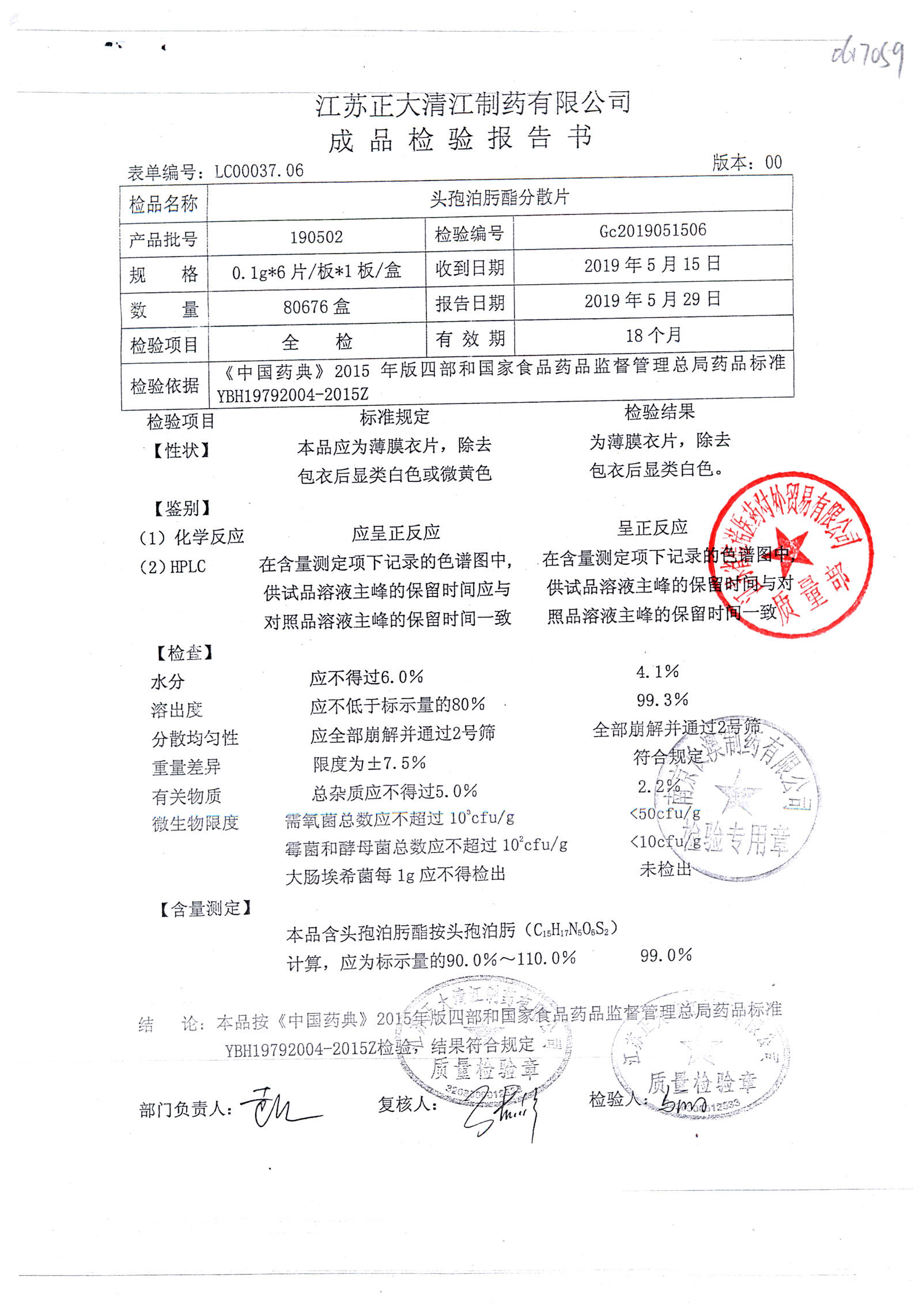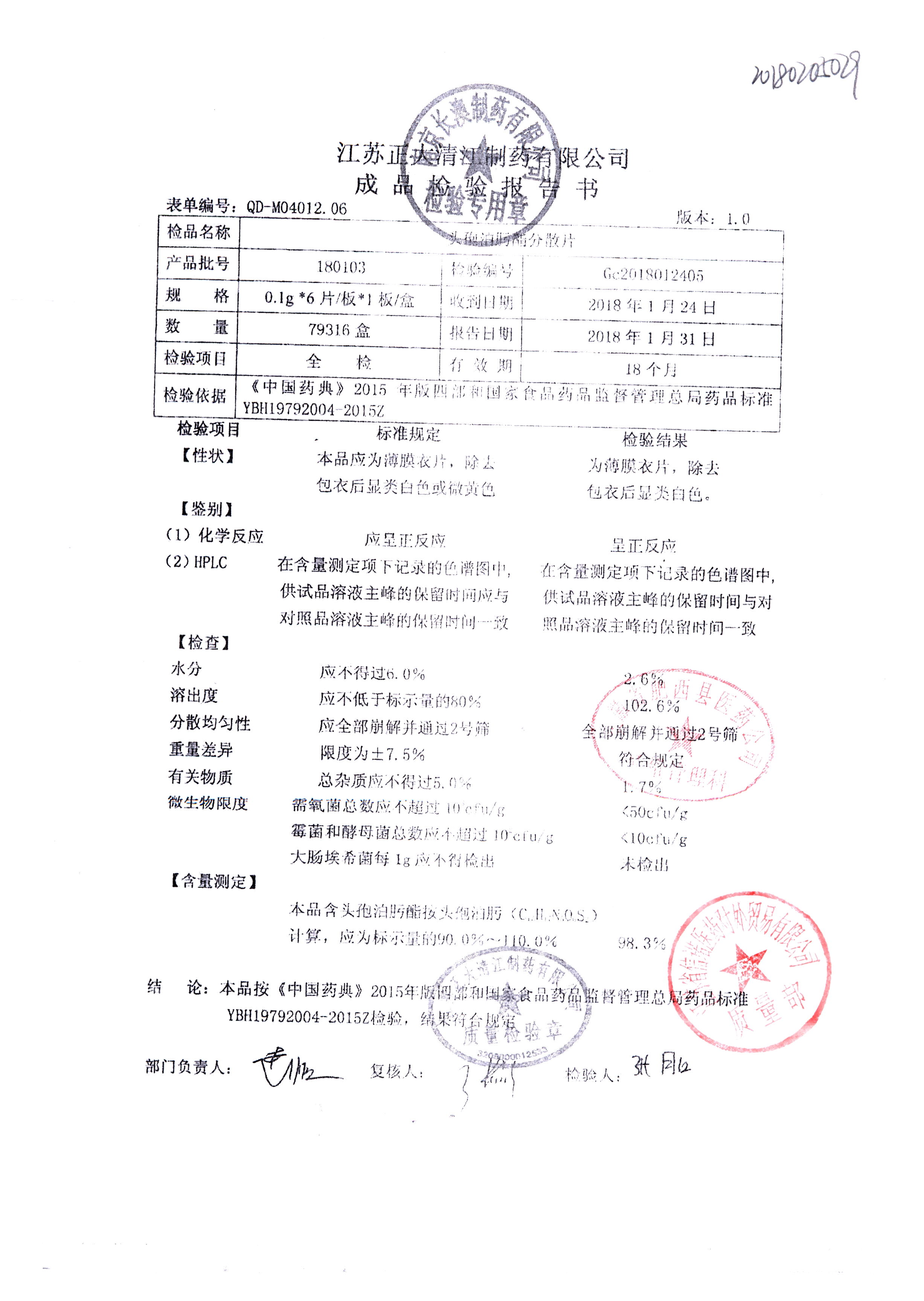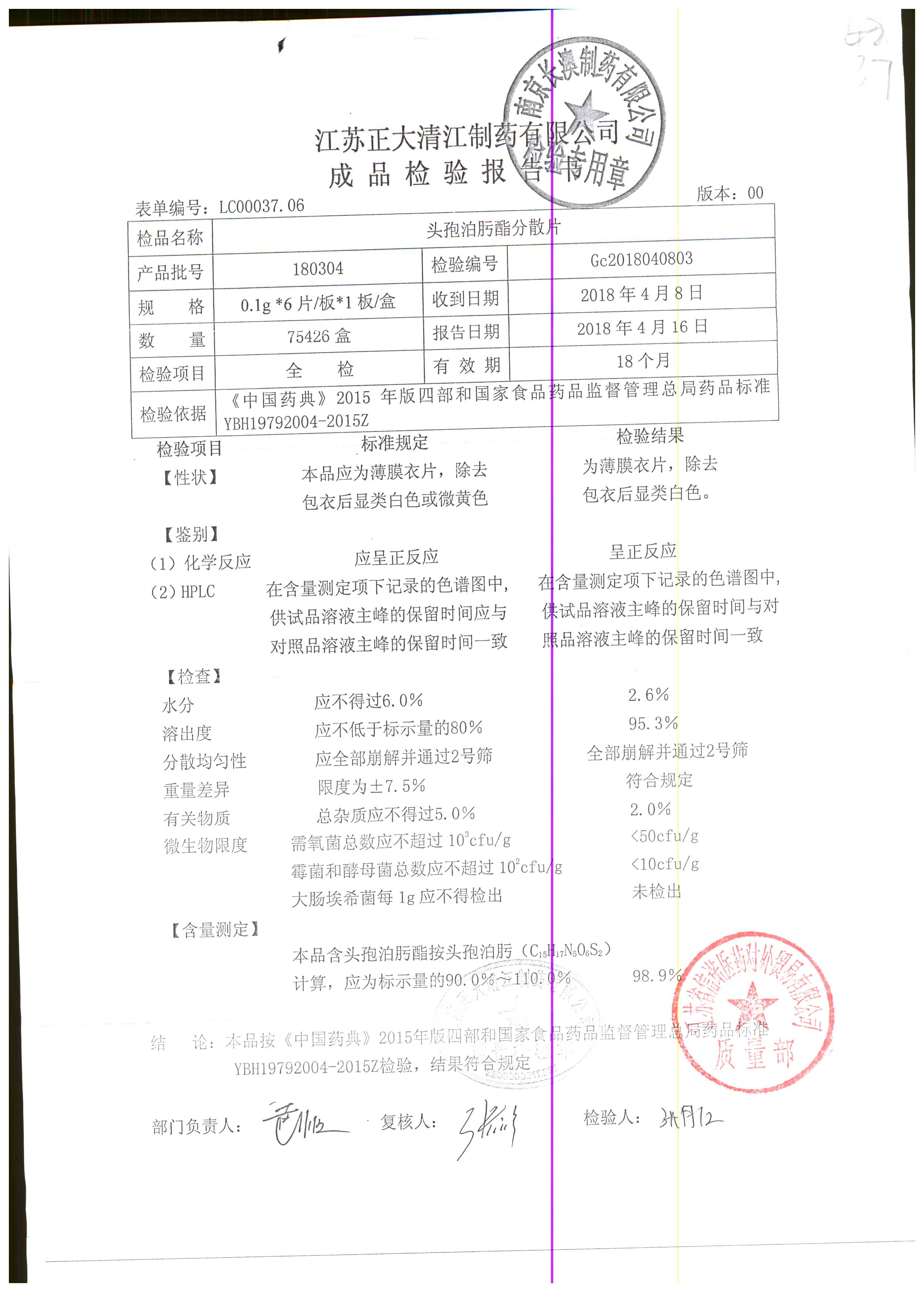 | 頭孢泊肟酯分散片 | 0.1g*6s | 180804 | 查看詳情 |