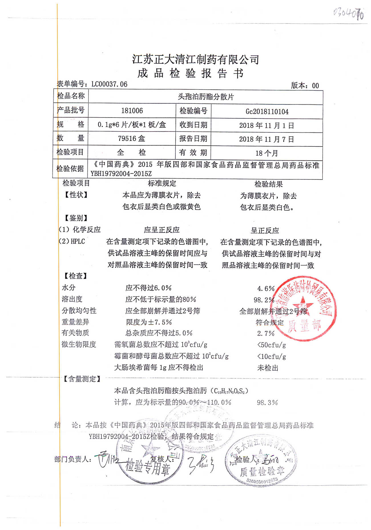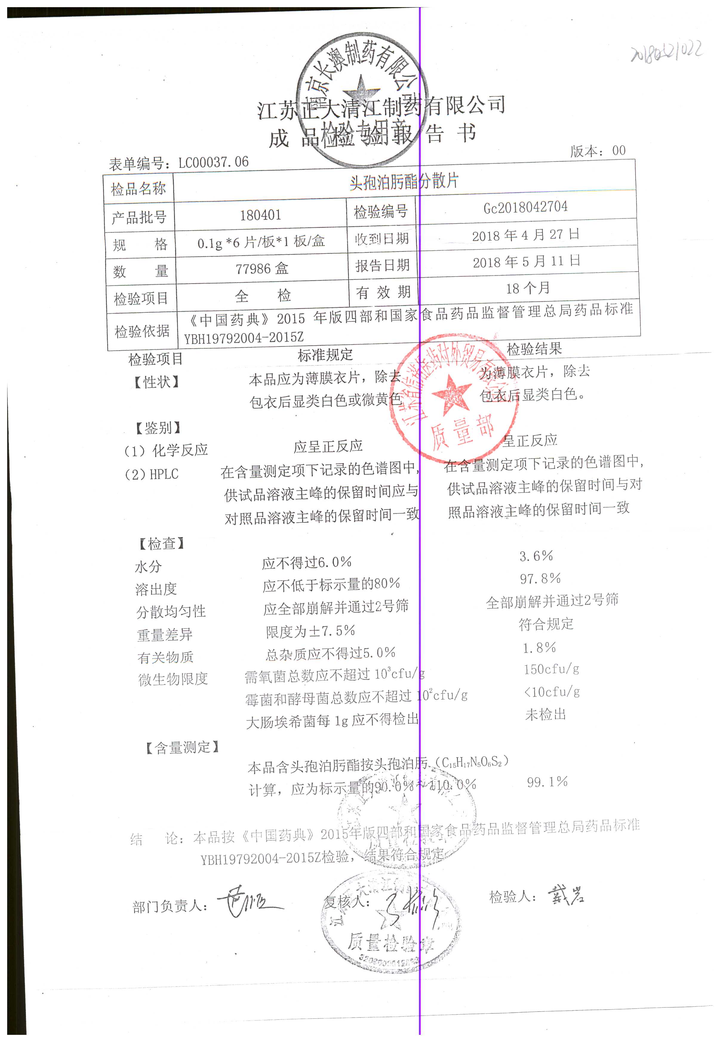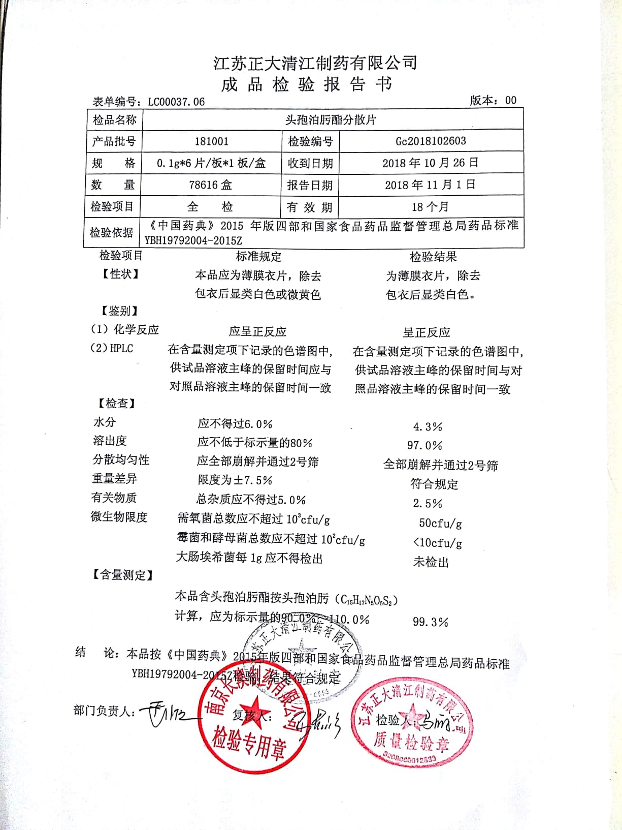 | 頭孢泊肟酯分散片 | 0.1g*6s | 180804 | 查看詳情 |