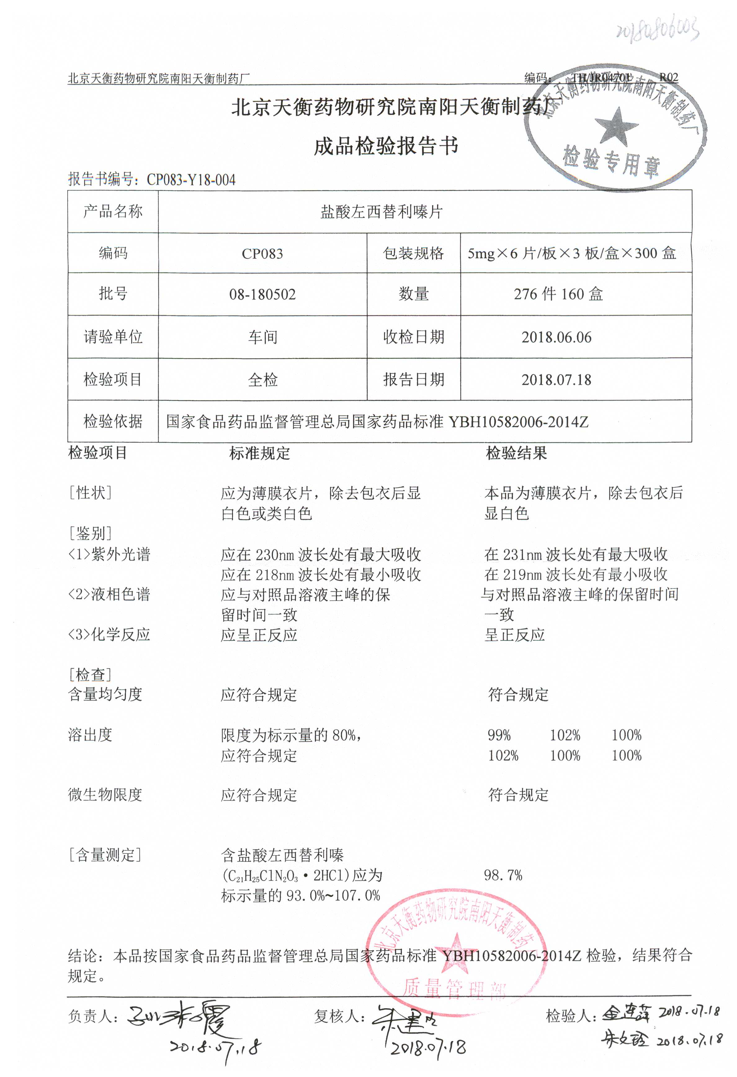 | 鹽酸左西替利嗪片 | 5mg*18s | 08-180901 | 查看詳情 |