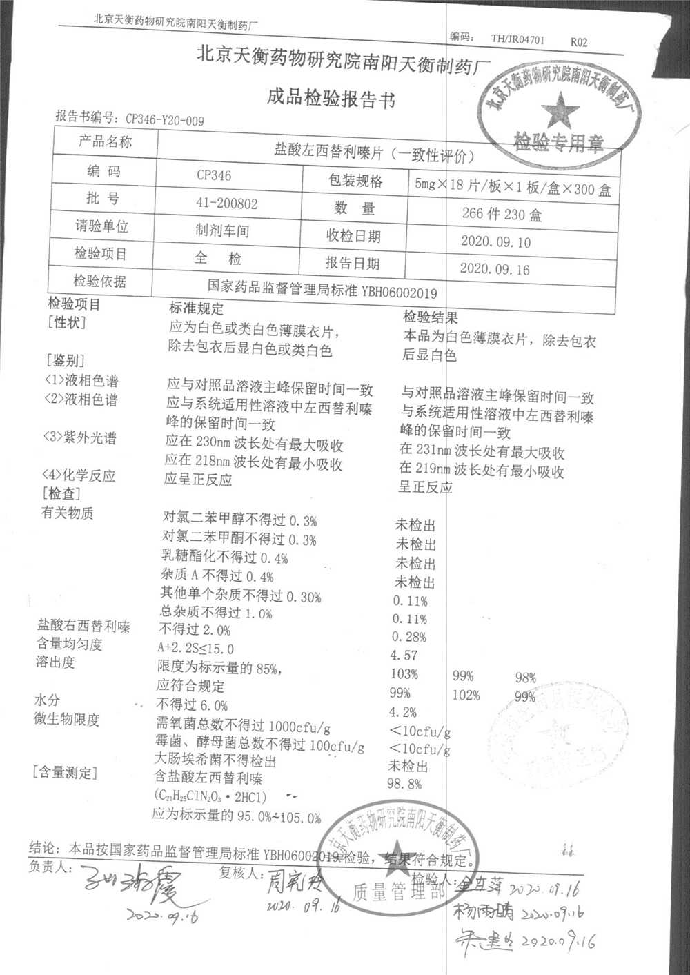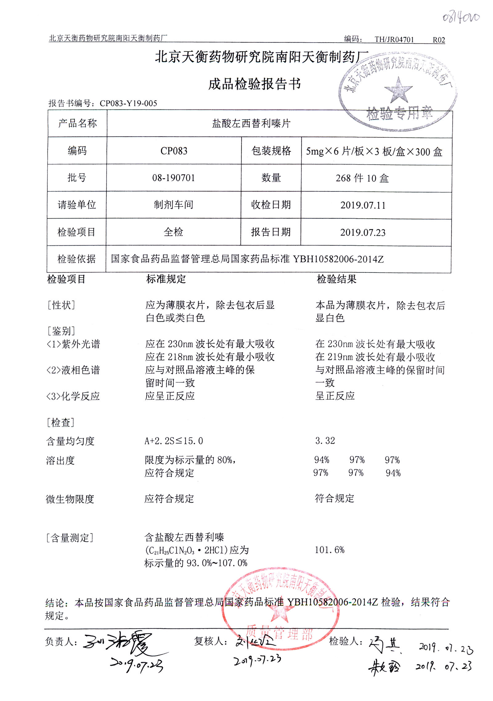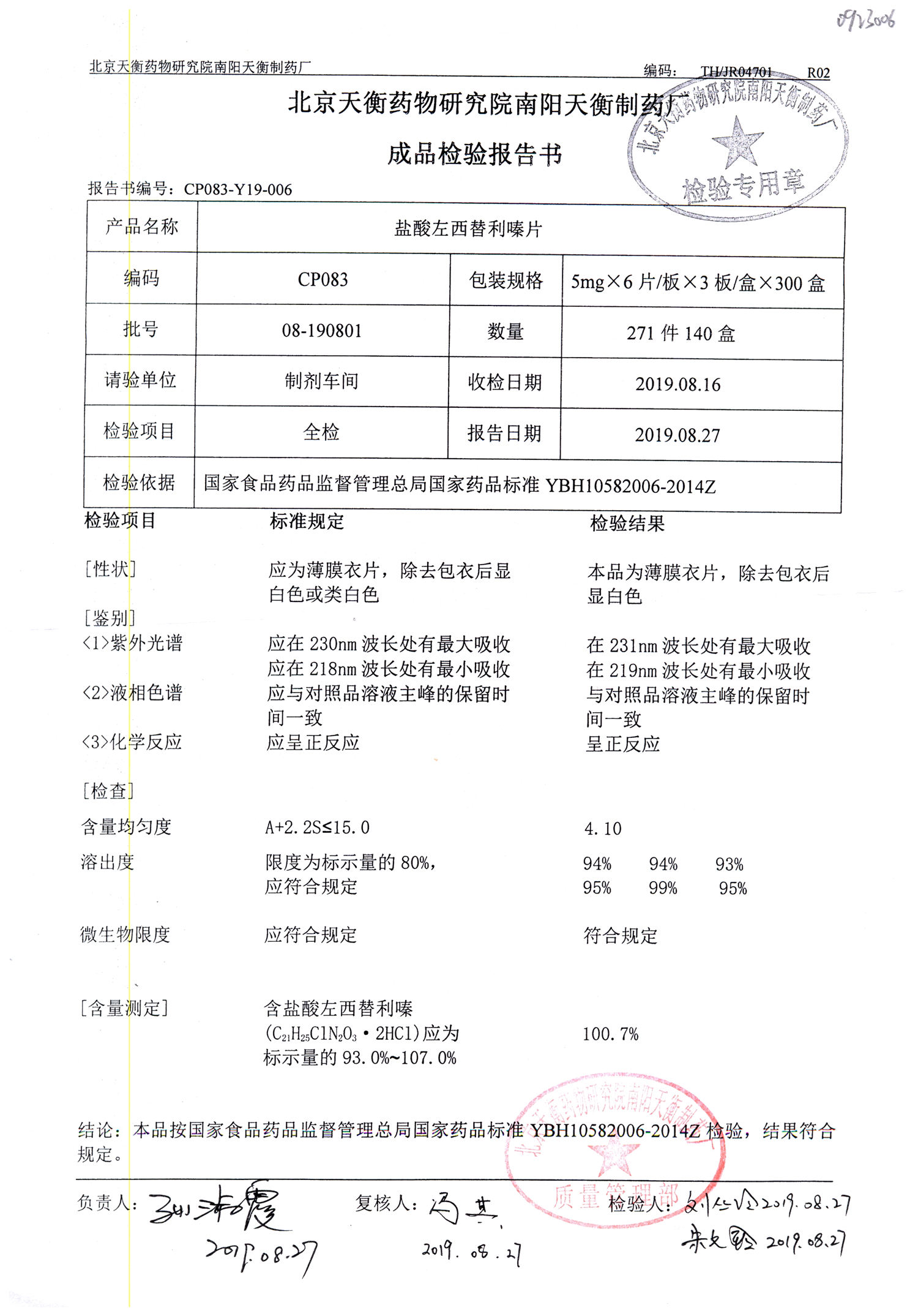 | 鹽酸左西替利嗪片 | 5mg*18s | 08-190801 | 查看詳情 |