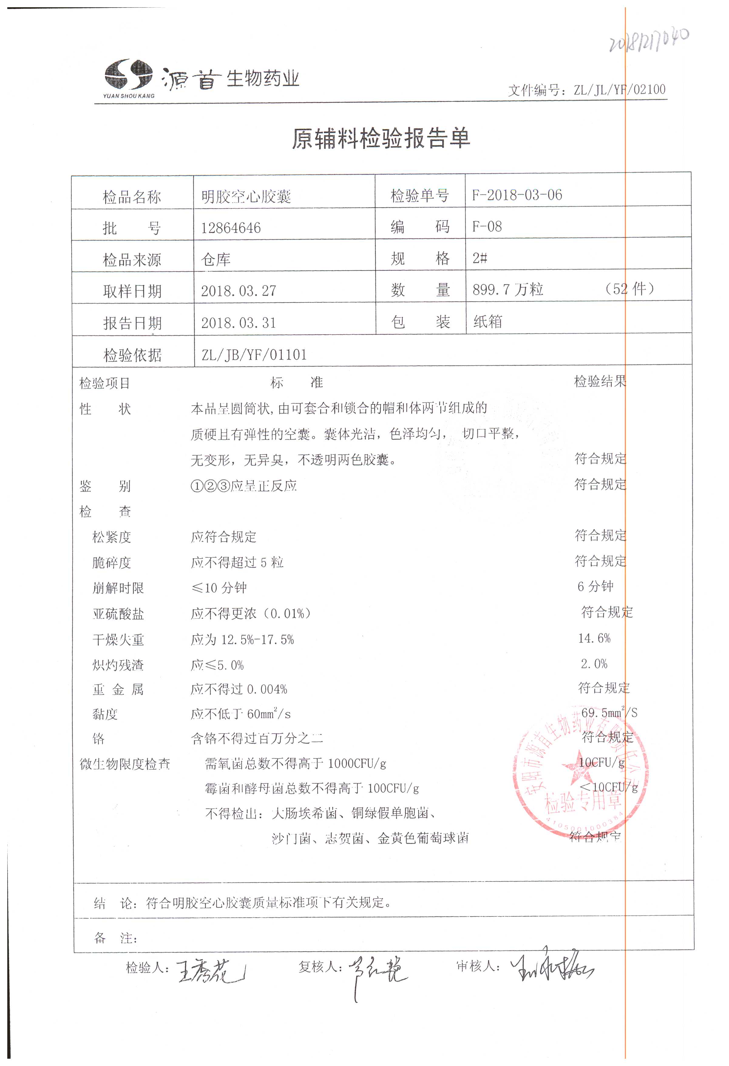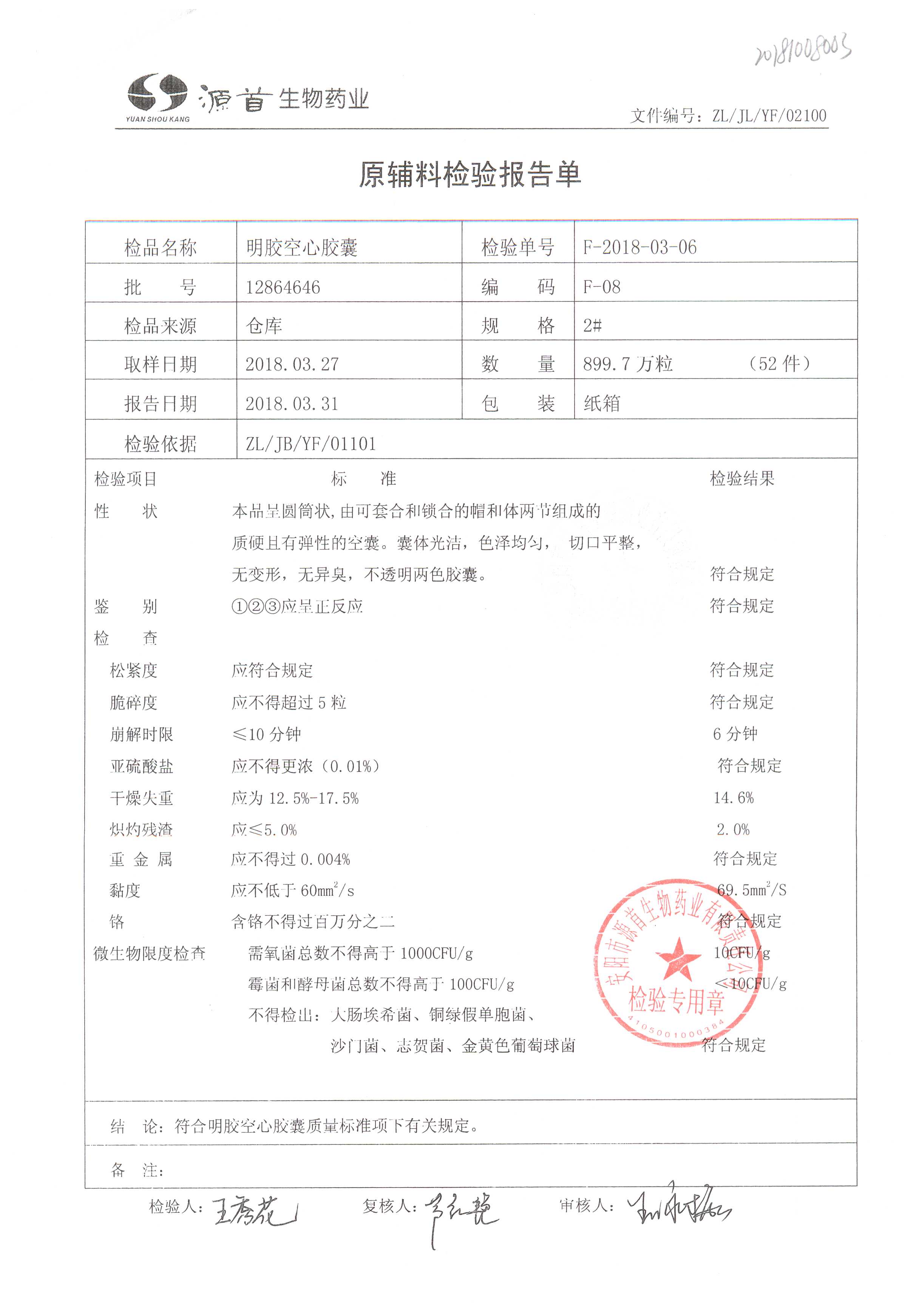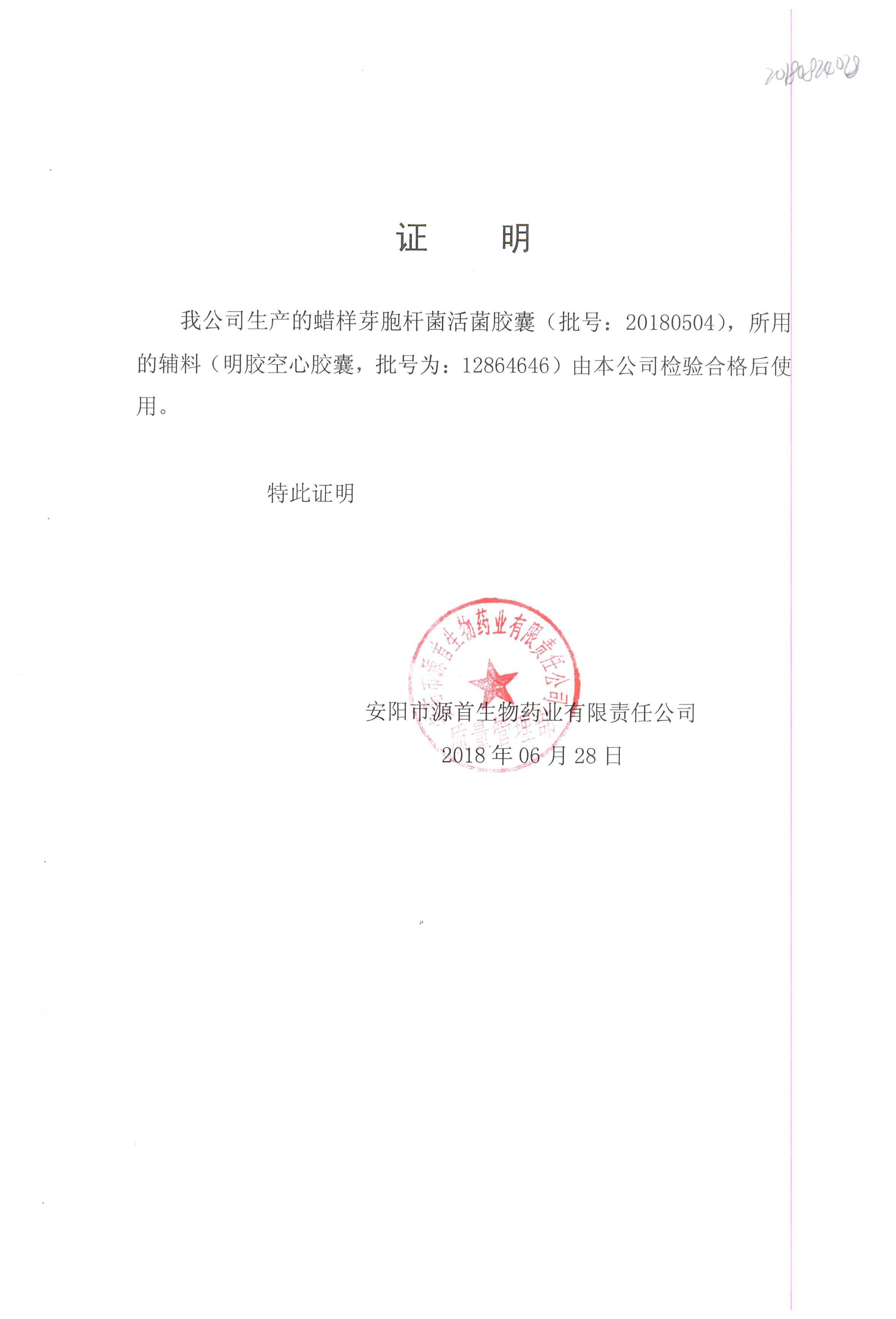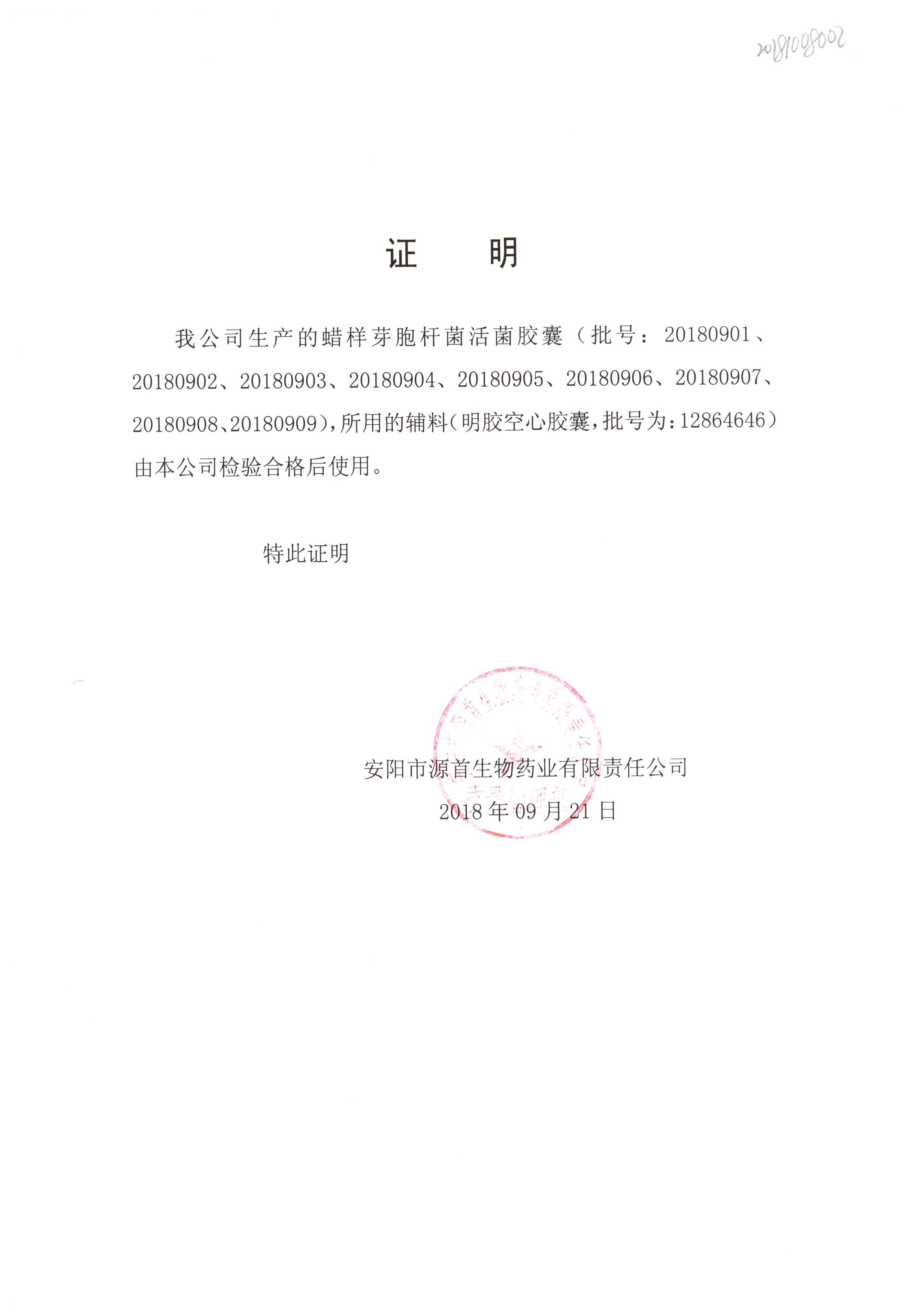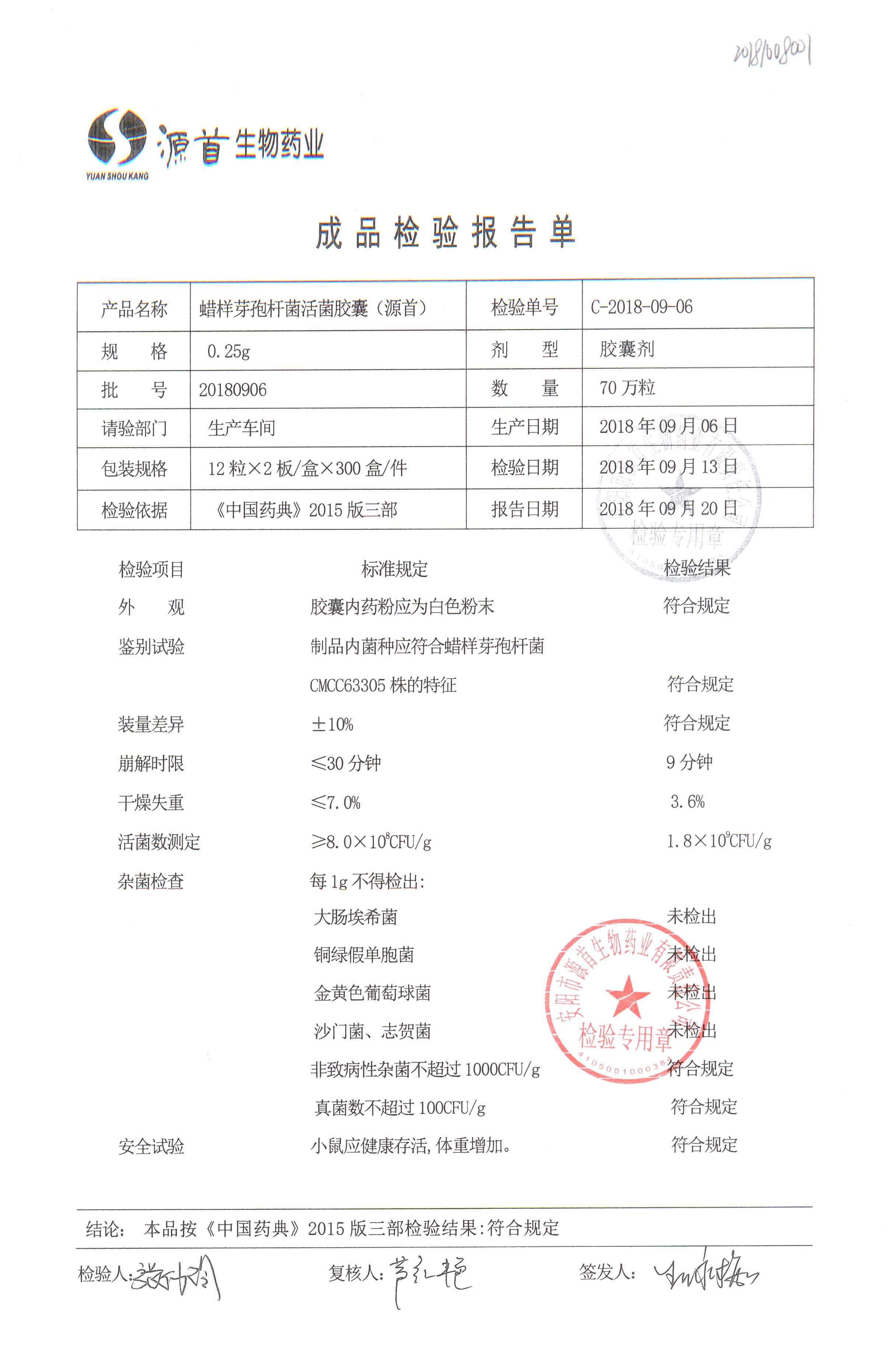 | 蠟樣芽孢桿菌活菌膠囊(源首) | 0.25g | 20180906(2/3) | 查看詳情 |