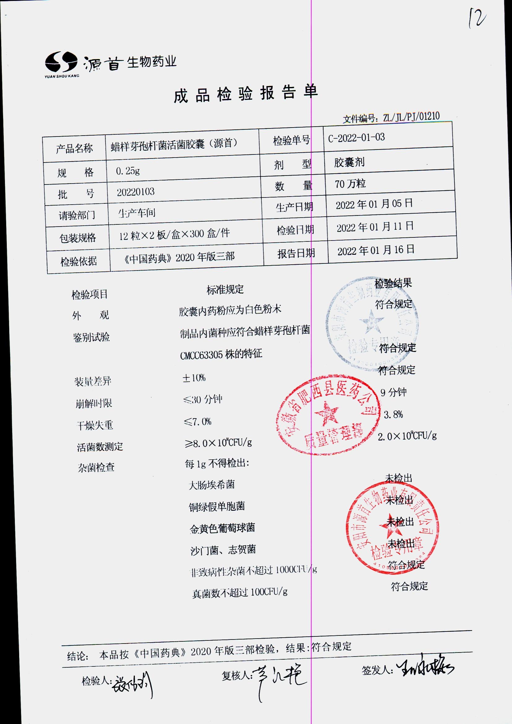 | 蠟樣芽孢桿菌活菌膠囊(源首) | 0.25g | 20220103 | 查看詳情 |
