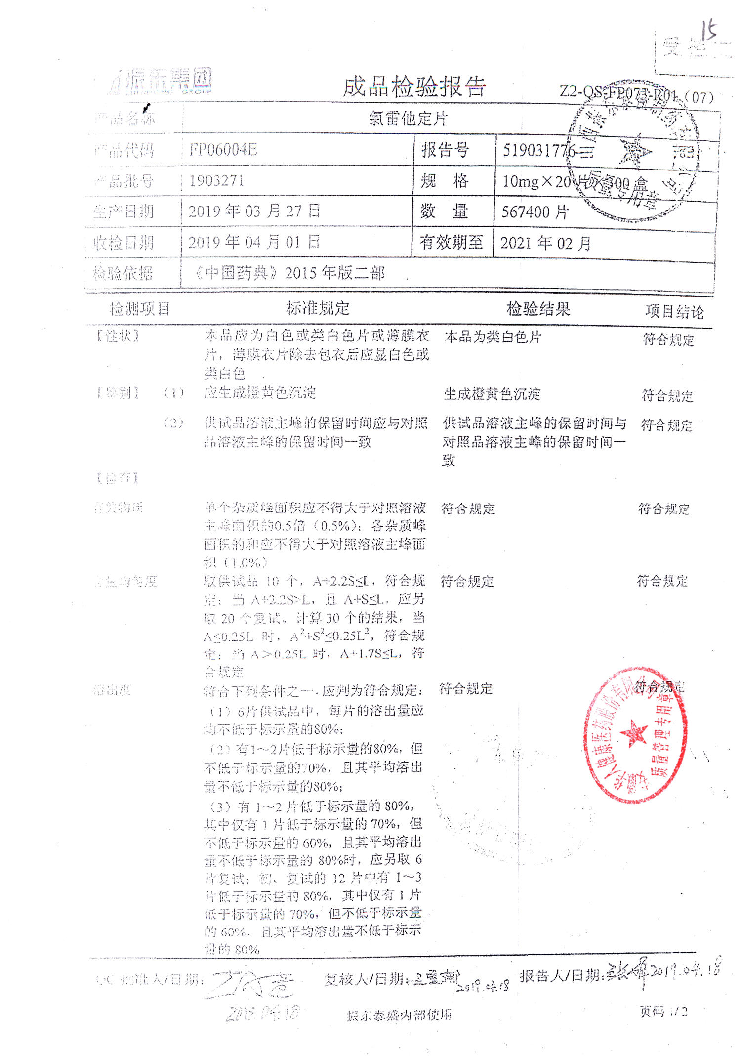 | 氯雷他定片 | 10mg*20s | 1903281(2/2) | 查看詳情 |