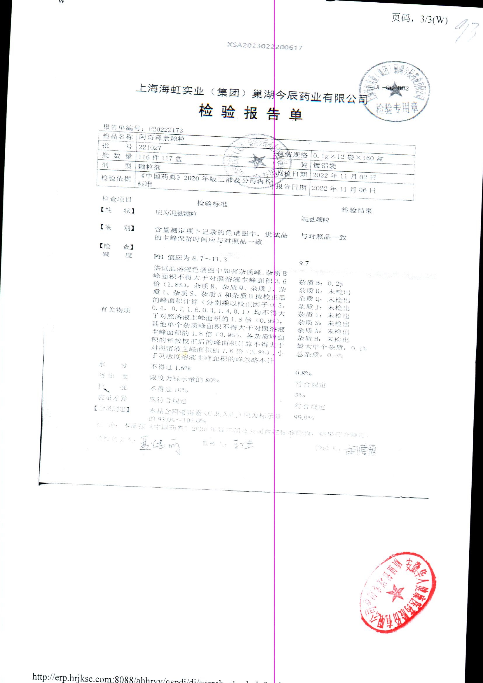 | 阿奇霉素顆粒 | 0.1g-12袋 | 220207 | 查看詳情 |